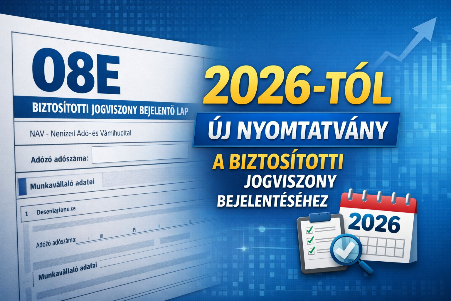 2026. január 1-jétől a T1041-es nyomtatvány helyett a 08E jelű űrlappal jelenthető be a biztosítotti jogviszony. A Nemzeti Adó- és Vámhivatal (NAV) közzétette a mezőazonosítókkal ellátott nyomtatványkép és a kitöltési útmutató tervezetét, hogy segítse az adózók és szoftverfejlesztők felkészülését a változásokra.